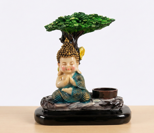 Buddha Figurine with Tree Canopy, Meditating Monk Statue, Teal and Gold, Resin, Home Decor with Tealight Holder